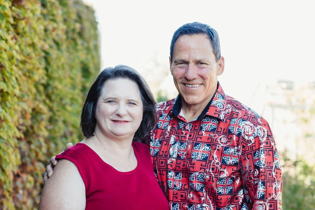 Bruce and Becky smiling standing outdoors near a hedge with green and yellow leaves, with a cityscape in the background.